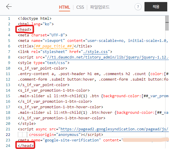 <head> </head> 사이에 복사한 코드를 붙여 넣고 적용하면 등록이 완료됩니다.