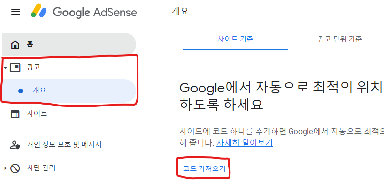 사이트 추가가 끝났으면 광고 > 개요 > 코드 가져오기를 클릭합니다.