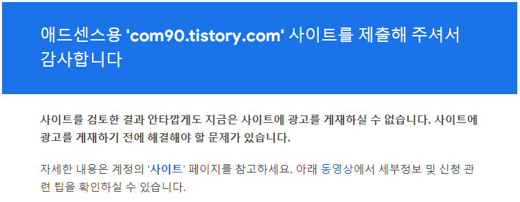 애드센스 심사를 받을 때 애드센스 코드가 등록되어 있지 않으면 심사 기간이 오래걸리고 결국 아래와 같은 메일이 도착하면서 심사 보류가 됩니다.